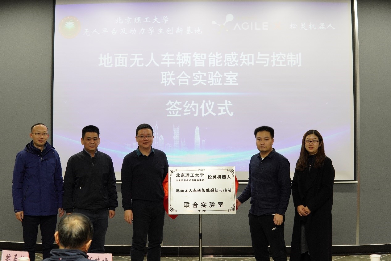 2020年11月26日,北京理工大学车辆工程系举行松灵机器人有限公司无人平台捐赠及共建“地面无人车辆智能感知与控制联合实验室”揭牌仪式。松灵机器人公司CEO魏基栋、松灵华北大区经理周真真、333体育-在线体育投注-高赔率体育竞猜平台 党委副书记、副院长孙硕、333体育 副院长黄彪、车辆工程专业责任教授林程、电动汽车研究所副所长陈潇凯、电动汽车研究所副研究员、无人平台及动力学生创新创业基地指导教师张旭东参加了本活动。活动由车辆系党总支书记邹渊教授主持。